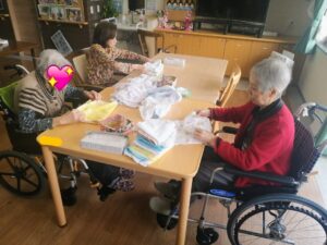 いつも入居者様におしぼりやタオルなどを畳んでもらっていますが、今日は3人で!💖💖💖
