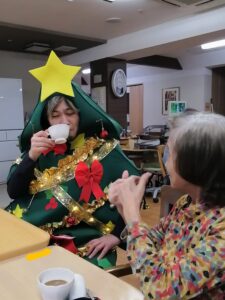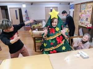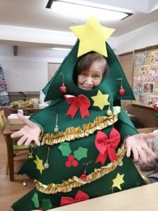 「わたしも着てみよーかしら💖💖💖」と入居者様がツリー🎄の着ぐるみ?!を着用👏