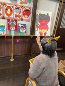 節分で、鬼のイラストに向かってボールを投げて楽しみました。😊✨