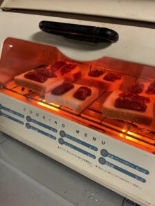 オーブントースターで焼きます!羊羹がぶくぶくとしていました!