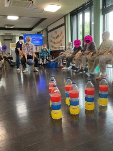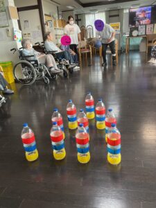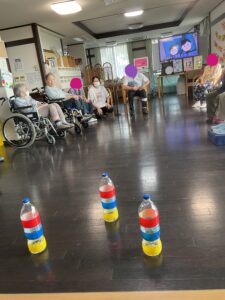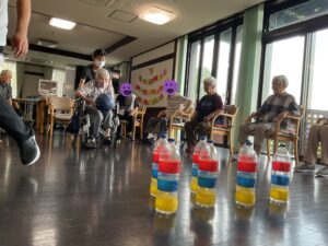 少量の水を入れたペットボトルを倒しますよo(*^▽^*)┛